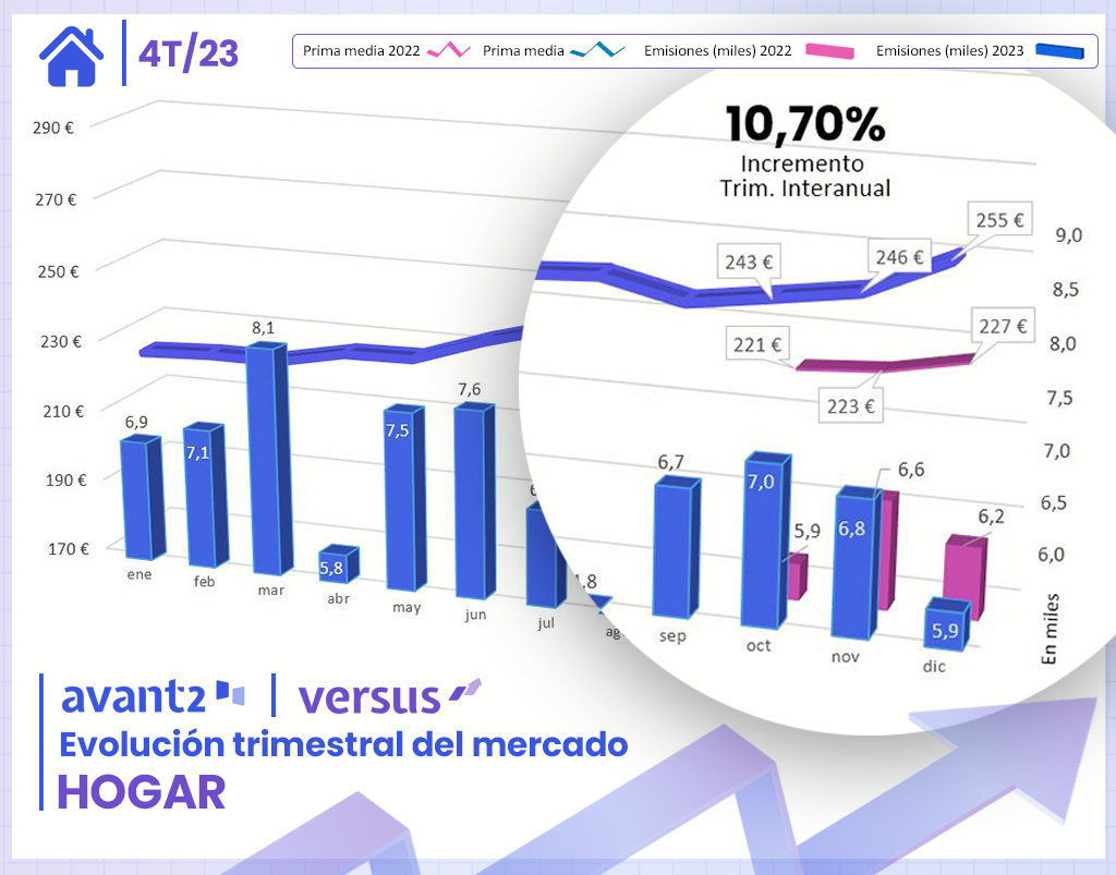 Por último, Codeoscopic ha cerrado Hogar con más de 19.000 emisiones en el cuarto trimestre, lo que supone un aumento del 5,8% con respecto al año anterior. No obstante, a nivel global, el volumen de emisiones ha crecido un 18,9%, impulsado principalmente por un fuerte incremento en el primer semestre. En cuanto a la evolución de la prima media, los seguros de Hogar comenzaron el 2023 con un tímido incremento interanual del 3% para finalizar con un repunte del 10,7% en el último trimestre. Al final, en 2023, la subida se ha quedado en un 6,5%, alcanzado también su máximo en diciembre, situándose la prima media en 255 euros.
