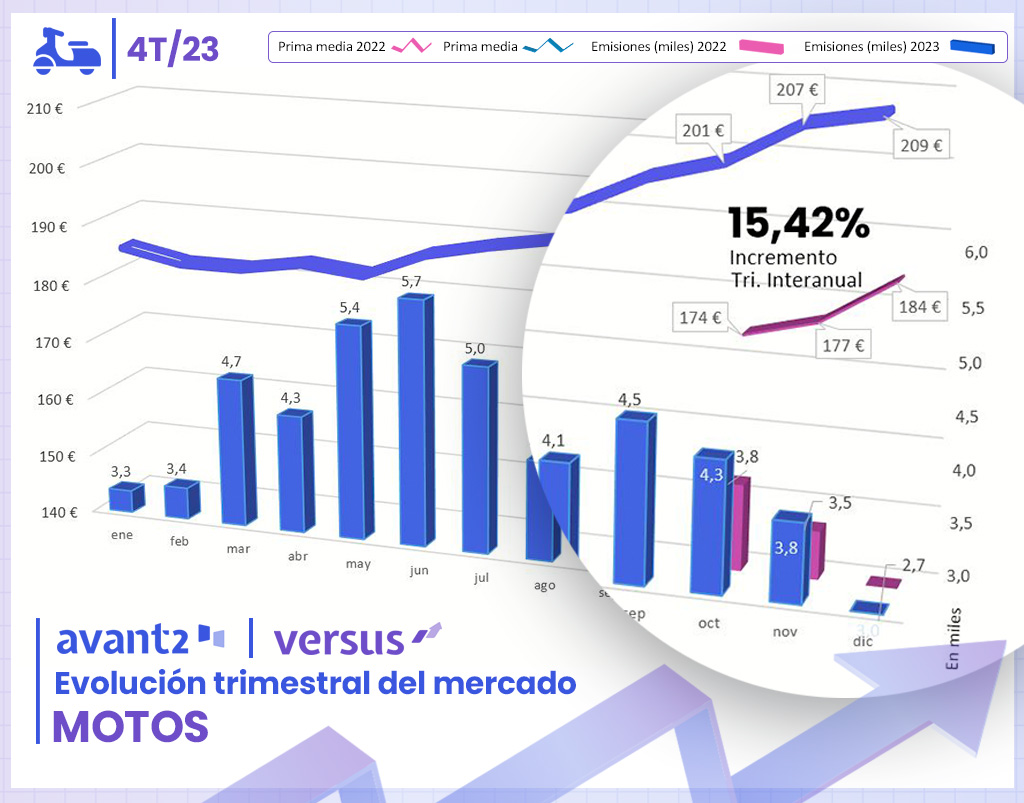 Los seguros de motos también han mostrado aumentos tanto en emisiones como en la prima media. En cuanto a las emisiones, Codeoscopic ha registrado un incremento del 10,3% a nivel interanual en el cuarto trimestre y un aumento del 16,1% en 2023 respecto al año anterior. Respecto a la prima media, este negocio ha experimentado una subida interanual del 14% respecto a 2022, llegando a incrementarse hasta el 17,2% en el tercer trimestre. Al igual que Autos, en diciembre alcanzó su valor más alto con una prima media de 209 euros.