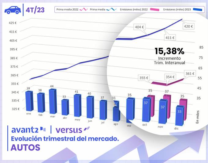 En Autos, Codeoscopic ha emitido un 6% más de pólizas que en 2022, cerrando el cuarto trimestre con más de 107.000 emisiones, una cifra cercana a la obtenida en el mismo periodo del ejercicio anterior. En estas emisiones, el multitarificador observa que la prima media ha ido aumento progresivamente durante el año. En la primera parte del 2023, la prima media se incrementó un 8,3%, elevándose hasta el 15,4% en el último trimestre. De esta manera, el crecimiento anual de la prima media ha sido del 11,6% en 2023, alcanzando su valor máximo en diciembre, con una prima media de 420 euros.