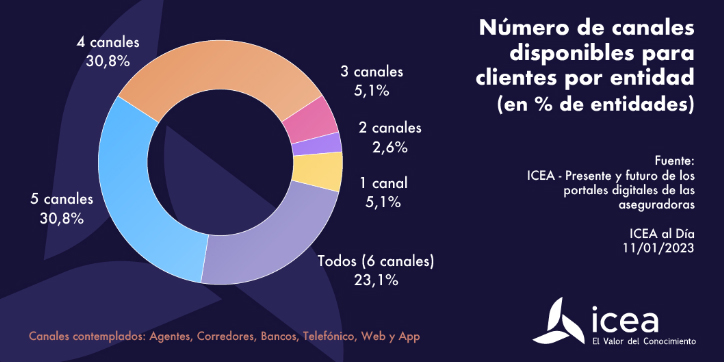 ICEA ha analizado la situación actual de los distintos canales físicos y online en las compañías de seguros. De su análisis se destaca que únicamente el 23,1% de las entidades cuenta con 6 canales para distribuir sus productos como son agentes, corredores, bancos, teléfono, web (portales digitales) y App.