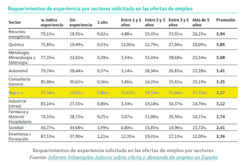 La experiencia profesional es un requisito básico en el 79,6% de las ofertas de empleo de España. En el sector seguros baja ligeramente y en el 73,3% de las ofertas se requiere experiencia previa cuya media se sitúa en los 3,3 años. Son datos extraídos del último Informe Infoempleo Adecco sobre Oferta y Demanda de empleo en España.