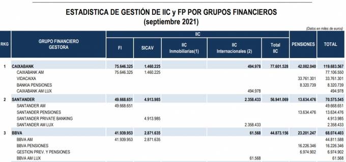 El primer puesto vuelve a estar ocupado por CaixaBank con un volumen total de activos gestionados de 119.683 millones de euros; seguido de Banco Santander con 70.575 millones y BBVA con 68.074 millones.