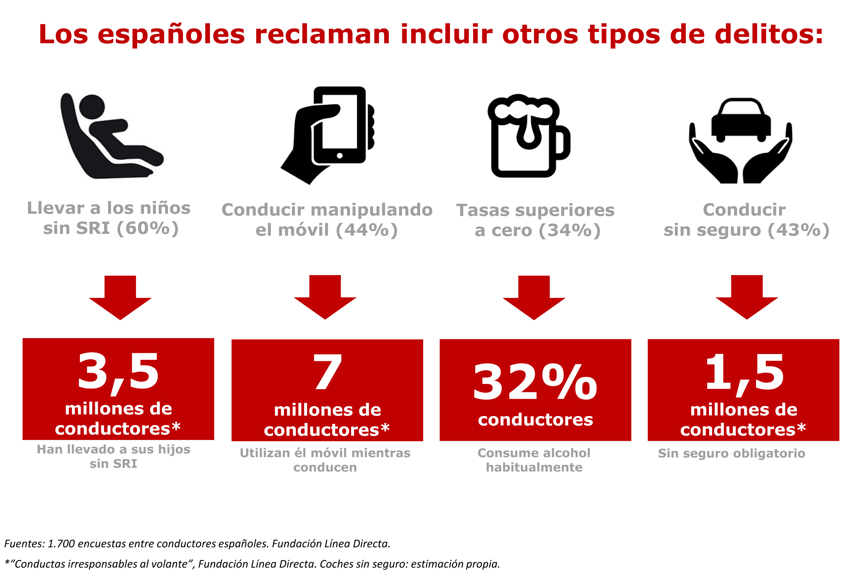 Según ha destacado Francisco Valencia, director general de Fundación Línea Directa, el 35% del total de delitos que se comenten en España son contra la seguridad vial, son los más numerosos. 650.000 conductores desde 2008 han sido condenados por delitos de este tipo; el 85% a través de juicios rápidos (menos de 48 horas). La proporción de procesos que acaban en sentencia condenatoria ha aumentado en los últimos años, con una media del 70%, siendo en 2015 ya del 85%. 6 de cada 10 delitos contra la seguridad vial se cometen por conducir tras consumir drogas o alcohol. Especialmente alarmante es el dato de que el 42% de los conductores fallecidos habían bebido o tomado drogas.