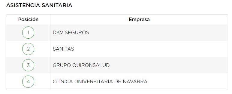 DKV y Sanitas también están incluidas entre las 100 compañías con mejor reputación en los puestos 21 y 23 respectivamente, aunque el ranking Merco las incluye en el grupo Asistencia Sanitaria junto con Quirónsalud y la Clínica Universitaria de Navarra.