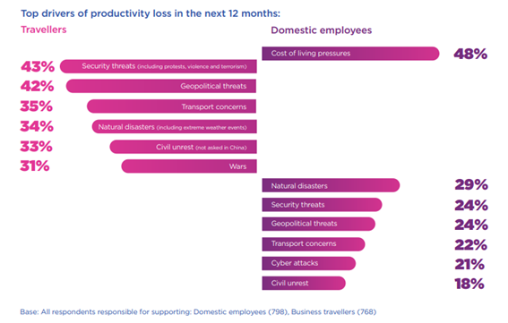 International SOS muestra un "preocupante" mapa de riesgos para 2023 en todo lo que afecta a la protección de trabajadores en entornos internacionales. Las conclusiones de su informe Risk Outlook 2023 y del Risk Map indicnan que los efectos de la pandemia disminuyen en muchos países pero al tiempo los riesgos globales tienen el potencial de disminuir los niveles de productividad. La razón es que la crisis del coste de vida y la difícil situación de la seguridad afectarán a los empleados.