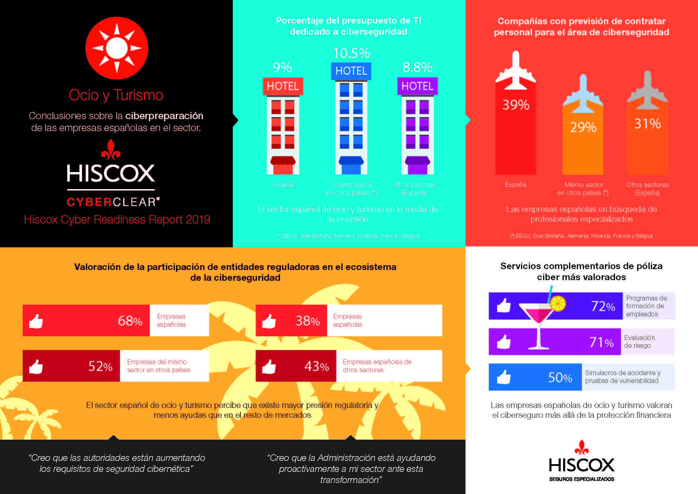 Los datos pertenecen al estudio Hiscox Cyber Readiness Report 2019, en el que se analiza la situación y estrategias de ciberseguridad del tejido empresarial de 7 países: España, EEUU, Gran Bretaña, Alemania, Holanda, Francia y Bélgica. Las empresas españolas de ocio y turismo dedican un 9% de su presupuesto anual de TI a invertir en ciberseguridad. Una cifra muy similar al 8,8% que dedican, de media, las compañías nacionales de otros sectores. En el resto de países analizados en el informe de Hiscox, el presupuesto medio de las empresas del sector turístico se eleva, ligeramente, hasta el 10,5%.