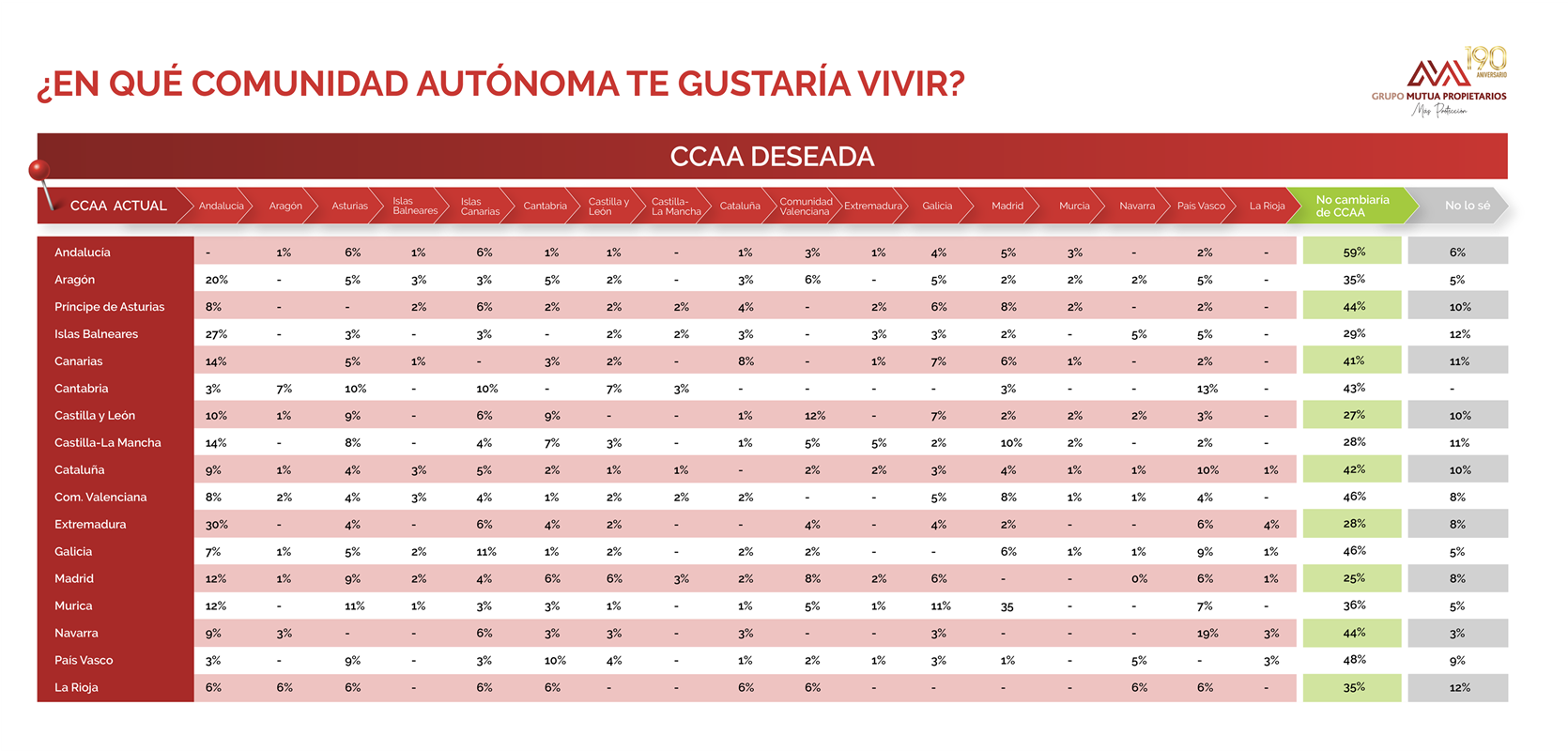 El 27% de los españoles buscaría otro lugar en el extranjero donde residir y ahí se registran variaciones, con Europa a la cabeza como destino favorito, aunque desciende del 20% al 18% y le siguen de lejos otras alternativas como Norteamérica (3%), Sudamérica (2%), Asia (1%) y África (1%). Y entre las regiones más deseadas para vivir: Andalucía (9%), Asturias (6%), País Vasco (5%) e Islas Canarias (5%).