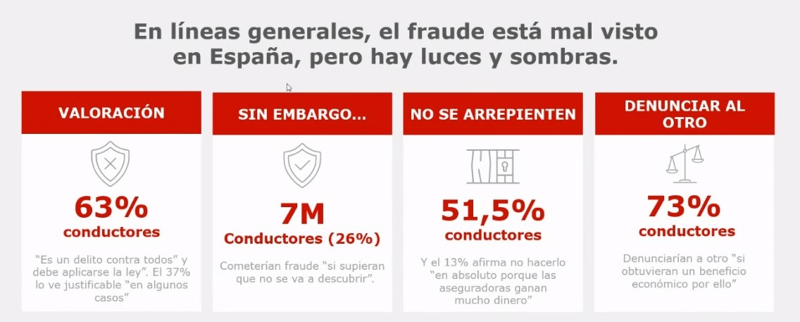 7 millones de españoles, el 26% de quienes tienen contratado algún seguro, han declarado que cometerían algún tipo de fraude si supiesen que no les van a descubrir. Es una cifra altísima que debía sonrojarnos y sobre todo hacernos reflexionar sobre la falta de concienciación sobre el inmenso daño que hace a la sociedad permitir este tipo de conductas.