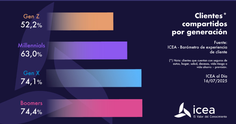 Detallado el grado de diversificación por generaciones, los Baby Boomer concentran el mayor número de clientes que tienen sus seguros compartidos en varias compañías de seguros (74,4%). Le siguen los de la Generación X con el 74,1%, mientras que los más jóvenes como Millennials y la Generación Z con el 63% y el 52,2%, respectivamente, son los que menos diversifican sus pólizas.