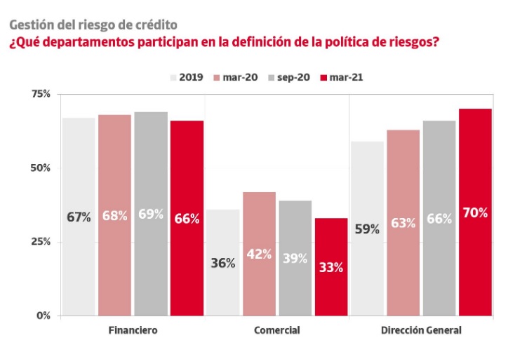 Frente a este crecimiento del papel del primer ejecutivo como último decisor y los departamentos comerciales, para aportar una visión de impacto en la primera línea de la cuenta, la existencia de unidades de riesgos sigue registrando valores mínimos: solo el 23% de las empresas cuenta con áreas especializadas en la gestión del riesgo de crédito comercial. Se trata de un indicador de hasta qué punto el peso de la gestión técnica de la política de riesgos del crédito comercial sigue recayendo, como una tarea más, en los departamentos financieros (66% de las empresas) y estamos todavía lejos de los niveles de creación de departamentos especializados que se produjo en la anterior crisis económica.