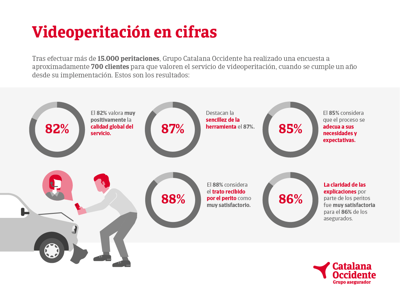 Tras un año de servicio y más de 15.000 peritaciones a distancia en el primer año, un 82% de los clientes del Grupo Catalana Occidente se han mostrado muy satisfechos con el servicio.
