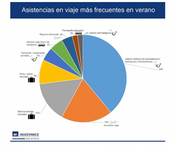 Según datos de la aseguradora, cerca de un 50% de las asistencias en el extranjero realizadas durante el verano tienen que ver con urgencias médicas (hospitalizaciones e intervenciones quirúrgicas un 39%, transporte o repatriación sanitaria un 5% y gastos odontológicos de urgencia un 2%). Otros de los problemas más frecuentes que subraya la entidad son las incidencias en el equipaje y cancelación del viaje.
