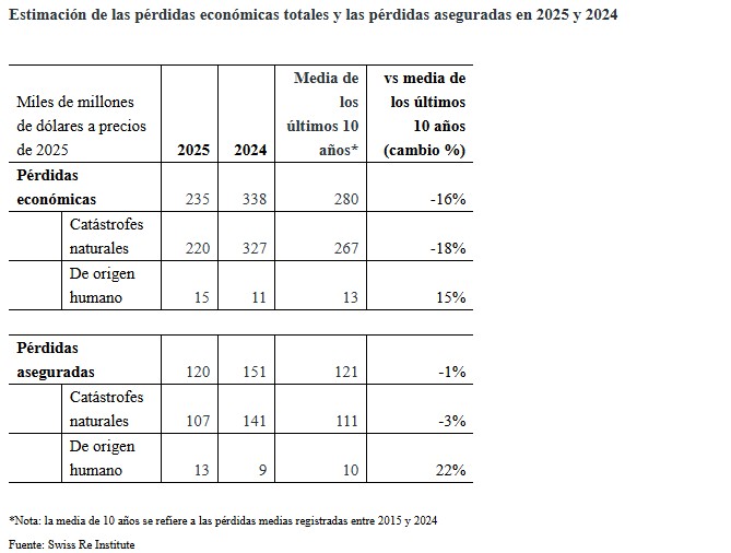 En total, en 2025, las pérdidas económicas totales se situaron en los 235.000 millones de dólares, mucho menos que en 2024 (338.000 millones). De los 235.000 millones, 220.000 millones son por catástrofes naturales y los 35.000 millones restantes por eventos de origen humano.