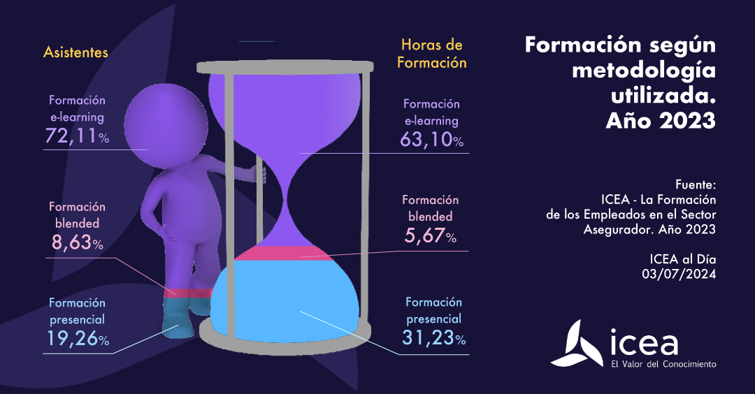 Hasta el 94,97% del personal en plantilla de las aseguradoras recibió algún tipo de formación en 2023, según los datos de ICEA. Además, precisa que las horas de formación suponen el 1,94% de la jornada total anual teórica, siendo la casi totalidad de estas horas en horario laboral. En cuanto a la metodología, la de e-learning sigue siendo mayoritaria, manteniendo el porcentaje de horas sobre el total respecto a 2022, aunque el número de asistentes ha bajado en 8 p.p.