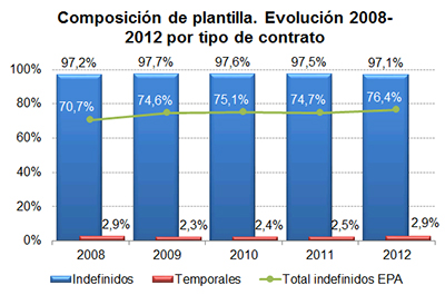 En el sector asegurador se da una de las tasas de trabajo temporal más bajas entre los diferentes sectores económicos de España, ya que en 2012 un 97,1% del personal en plantilla de las aseguradoras tenía contrato fijo, mientras que en el total nacional de todos los sectores, la tasa era del 76,4%, casi 21 puntos menos, según datos de ICEA.