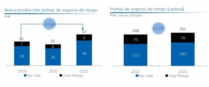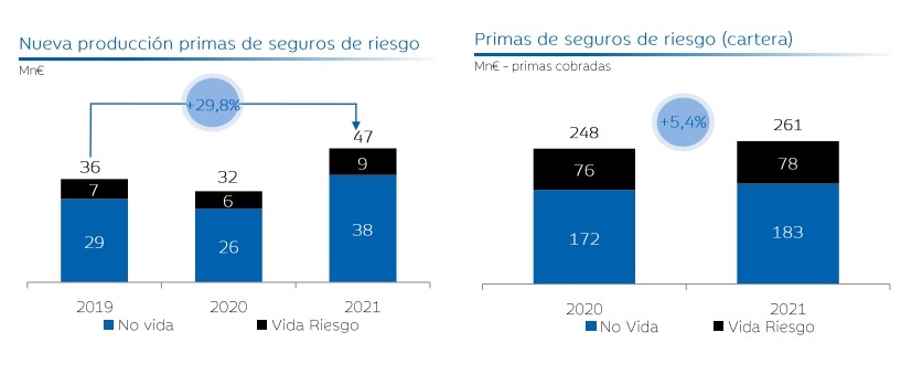 En cuanto a nueva producción, el negocio asegurador ha aumentado un 47% respecto a 2020, ascendiendo a 47 millones de euros, de los que 38 millones pertenecen a No Vida (+45,6%) y 9 millones a Vida Riesgo (+52,9%). Si se compara con el ejercicio 2019, el incremento es del 29,8%.