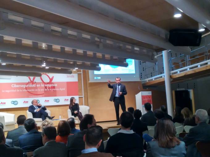 En el encuentro sobre ciberseguridad en la empresa, organizado por Aon y la apd, destacó que las empresas tienen que controlar un espectro de información demasiado amplio, mientras que los ‘malos’ únicamente necesitan un mínimo error para introducirse en los sistemas. Añadió que en el futuro todo se complicará con la incorporación del teletrabajo, y en parte el riesgo ha aumentado al exigir la administración que las relaciones con ella sean digitales.