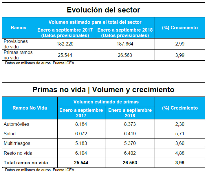 Los ingresos de las aseguradoras por la venta de pólizas a cierre del pasado septiembre ascendieron a 48.210 millones de euros, un 1,69% más que un año atrás. De este importe, 26.563 millones de euros correspondieron al ramo de No Vida, con un avance del 3,99%, y los 21.647 millones restantes al de Vida, con un descenso del 0,99%, según muestran los datos provisionales recabados por ICEA y difundidos por Unespa.