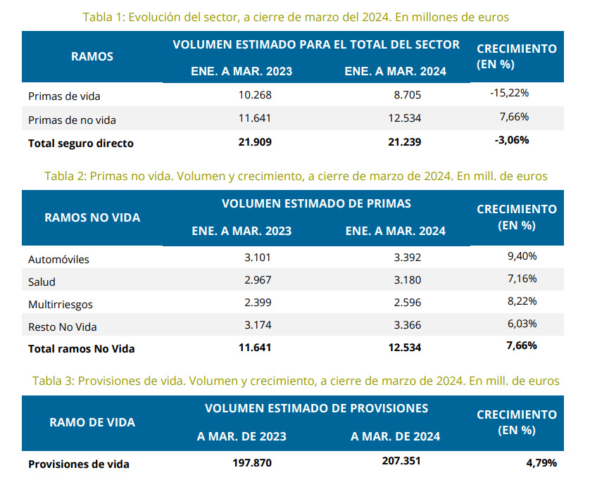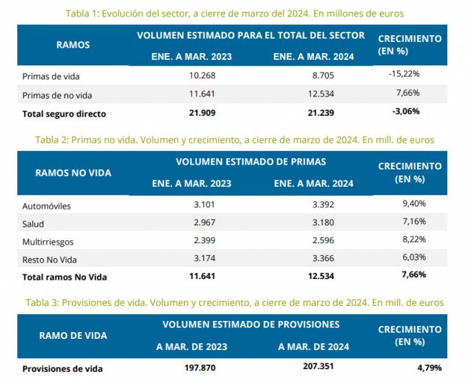El volumen total de primas del sector asegurador al cierre del primer trimestre del presente año sumaron un total de 21.239 millones de euros. Este dato es un 3,06% menos que en el mismo periodo de un año antes. Según los datos que acaba de