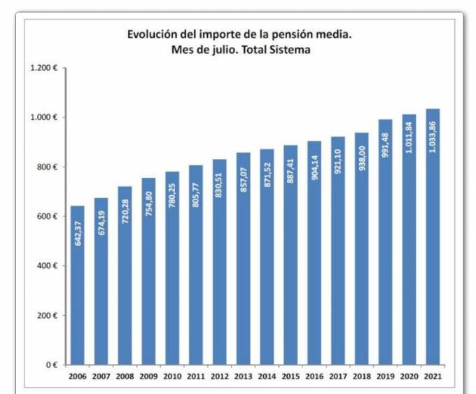 La pensión media de jubilación del sistema se ha situado de 1.189,74 euros, lo que refleja un incremento de 2,30% respecto del mismo mes de 2020, siendo la más alta correspondió la correspondiente al Régimen General, con 1.335,11 euros al mes, mientras que la más baja la registró el Régimen de Autónomos, 793,12 euros/mes.