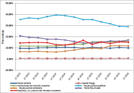 La estructura de las inversiones de los Fondos de Pensiones muestra que la renta fija representa el 58,15% de la cartera. La deuda pública española “sigue siendo la partida de inversiones con mayor peso en las carteras, como se observa a lo largo de todo el periodo de referencia, con un peso por debajo del 30% de la cartera por segundo trimestre consecutivo”. En cambio, el mayor incremento de inversión en este trimestre por parte de los Fondos de Pensiones es en la renta fija privada.