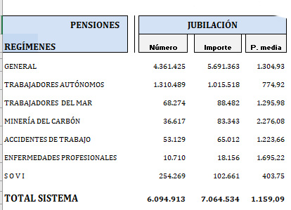 El importe total de las pensiones es de 9.879,16 millones de euros y más de dos tercios se destinaron al abono de las pensiones de jubilación, cuyo montante ascendió a 7.064,5 millones de euros. Esta cuantía creció un 3,42% en los últimos doce meses.