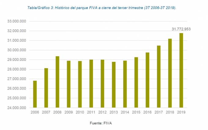 A cierre del tercer trimestre de 2019, el número de vehículos asegurados ha crecido un 1,89% en términos interanuales, ascendiendo a 31.772.953, según se extrae de los datos recabados en el Fichero Informativo de Vehículos Asegurados (FIVA) y facilitados por Unespa. Esto significa que, en los últimos 12 meses, el parque asegurado de vehículos a motor que circulan por España se ha incrementado en 587.907 unidades.