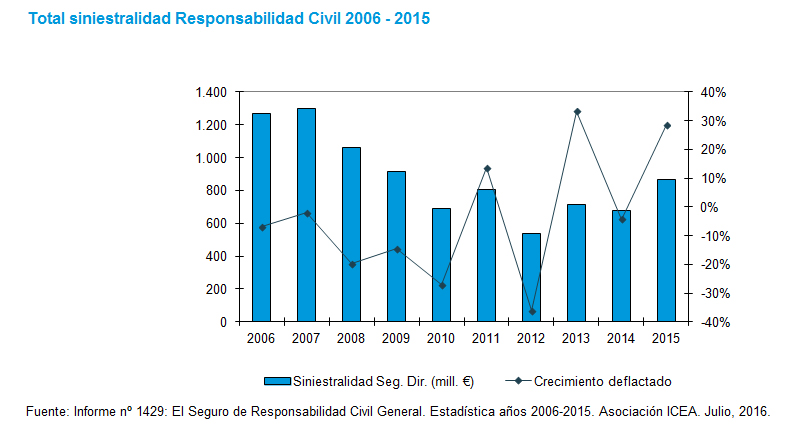 El total de indemnizaciones pagadas por siniestros de RC en general ha vuelto en 2015 a volúmenes similares a los que había en 2009. Según el informe ‘El Seguro de RC General. Estadística años 2006-2015’ de ICEA se aprecia un pago cercano a los 1.000 millones de euros y un crecimiento respecto a 2015 de prácticamente un 10%.