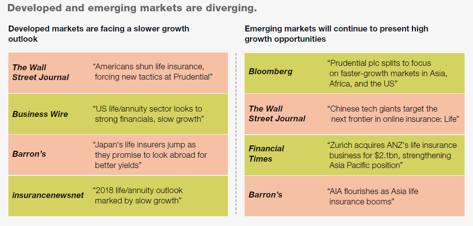 Para la firma de consultoría las oportunidades que aparecen en los mercados desarrollados pasan por la creciente preocupación por las pensiones y la edad de jubilación, el aumento de la riqueza o el cambio de tendencia desde las pensiones a los seguros privados.