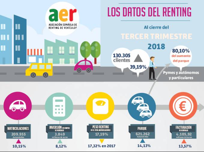 A 30 de septiembre de 2018, la flota de automóviles en renting en España se elevaba a 621.262 vehículos, lo que supone un crecimiento del 14,13% en relación al mismo periodo del ejercicio anterior, según datos publicados por la Asociación Española de Renting de Vehículos. Las pymes y las personas físicas –autónomos y particulares– han tenido una contribución del 80,10%. Otra conclusión a destacar es que el segmento de clientes que, porcentualmente, más ha aumentado su parque ha sido el de autónomos y particulares, con 48.102 vehículos, lo que significa un incremento del 82,69%. Mientras que las pymes –con menos de cuatro vehículos– son las que más han crecido en términos absolutos, registrando 119.733 unidades, un 29,12%.