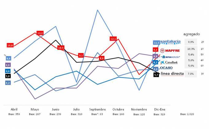 Entre las entidades más activas en oferta comercial, las primeras posiciones son para Mapfre (10,3%), santalucía (9,9%), Línea Directa (7,8%), CaixaBank (5,6%), Mutua Madrileña (5,4%) y Ocaso (5%). En cuanto a las aseguradoras más buscadas por los particulares la primera es Mapfre (13,3%), seguida de Línea Directa (6,9), Allianz (4,4%), AXA (3,7%) y CaixaBank (3,5%).