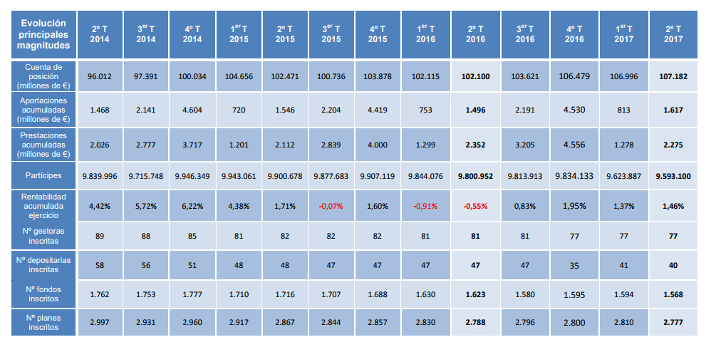 El patrimonio gestionado por los Planes y Fondos de Pensiones ha obtenido un crecimiento del 4,9% en el segundo trimestre de 2017 respecto al mismo periodo de un año antes. A finales de junio registró 107.182 millones de euros, cifra que representa el punto más elevado desde el segundo trimestre de 2014, periodo de referencia del Boletín de Información Trimestral de Planes y Fondos de Pensiones de la DGSFP referente al segundo trimestre del año. El crecimiento respecto a marzo es del 0,17%.