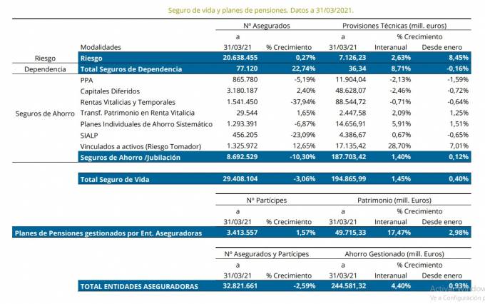 De esta cantidad 194.865 corresponden al total de seguros de Vida –incluidos Dependencia y Riesgo- y el restante (49.715 millones) a los Planes de Pensiones gestionados por compañías aseguradoras.