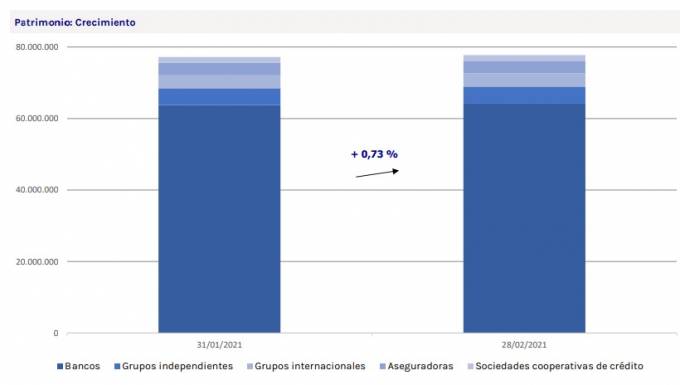 Los bancos mantienen su posición mayoritaria de cuota de mercado 82,50% y Caixabank se mantiene como líder por patrimonio gestionado, con 18.059 millones y una cuota de un 23,23 %.