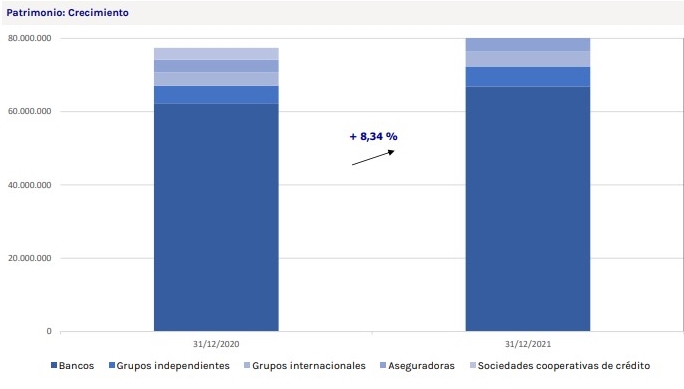 Por tipo de entidad, las sociedades cooperativas de crédito han registrado las mayores captaciones netas, con 203 millones, seguidas de las aseguradoras y los grupos internacionales, con 169 millones y 102 millones, respectivamente. En términos porcentuales, son las aseguradoras las que tienen un mayor incremento patrimonial, con un 13,48%, seguido de los grupos independientes con un 13,42%.