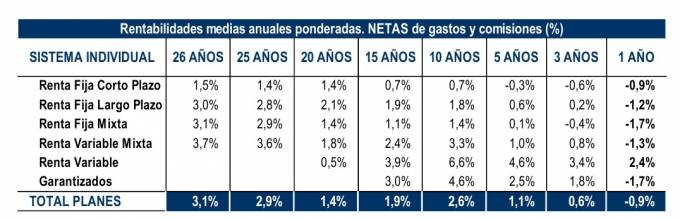 En el largo plazo los Planes de Pensiones continúan registrando una rentabilidad media anual del 3,1% y, en el medio plazo (10 y 15 años), presentan una rentabilidad del 2,6% y 1,9% respectivamente.