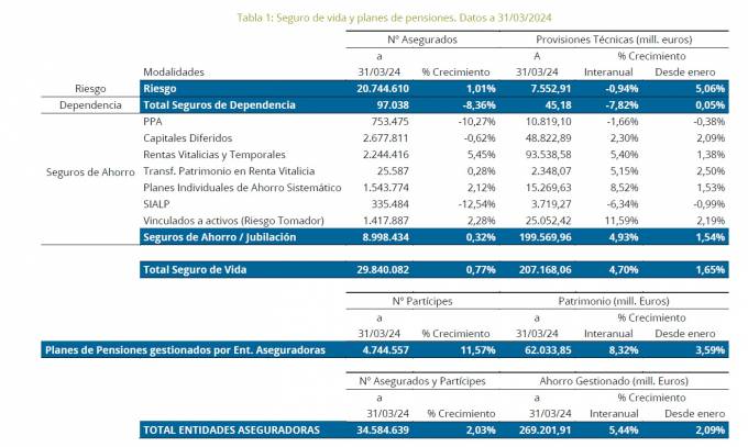 El patrimonio gestionado por el seguro en Vida y Pensiones crece un 5,44% hasta los 269.201 millones de euros en el primer trimestre del año, según datos facilitados por Unespa. De estos, 207.168 corresponden a seguros de Vida, un 4,7% superior a la del mismo periodo de un año antes mientras que 62.034 millones corresponden al patrimonio de los Planes de Pensiones de que aumentaron un 8,3% interanual.