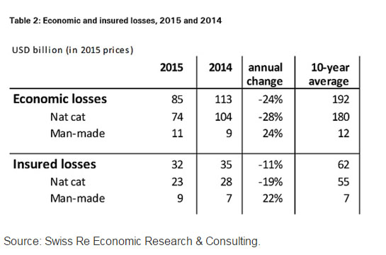 Swiss Re ha realizado una estimación y calcula que las perdidas económicas globales derivadas de las catástrofes naturales y las que origina el hombre alcanzarán este año los 85.000 millones de dólares. Esta cantidad refleja un descenso del 24,7% respecto a 2014 cuando ascendieron a 113.000 millones y mucho mejor a los 192.000 de hace una década.