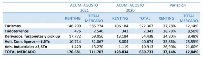 El peso del renting en el mercado se mantiene en el 24,82% en el mes de agosto, según datos de la AER. En el canal de empresa se eleva al 40,36%. Las matriculaciones se sitúan en 176.681 unidades, un 37,14% más que en el mismo periodo de 2020, mientras que las inversiones en compra de vehículos generadas por el sector del renting alcanzan los 3.762 millones con un crecimiento del 44,01% sobre el mismo periodo de 2020.