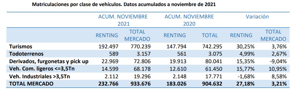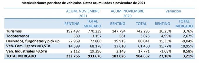 Además, las inversiones en compra de vehículos generadas por el sector del renting alcanzan los 4.970 millones de euros, a noviembre de 2021, con un incremento del 31,62%