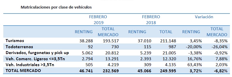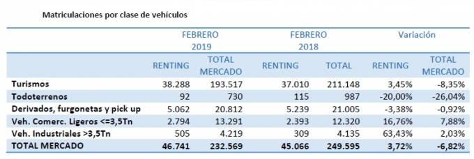 Agustín García, presidente de la Asociación Española de Renting de Vehículos, señala que "un mes más, estamos asistiendo a una caída generalizada de las matriculaciones de automóviles; si bien, el renting continúa creciendo, aunque ligeramente, con un incremento del 3,72%, lo que le hace ganar peso de mercado, que en el acumulado a febrero se sitúa en un 20,10%. A pesar de que el sector del renting continúa en cifras positivas, creemos que es primordial que el sector en general se recupere y, en este sentido, habrá que estar atentos a lo que pasa en los próximos meses, con procesos electorales abiertos y distintos anuncios, en mayor o menor medida, tranquilizadores para la industria de automoción".