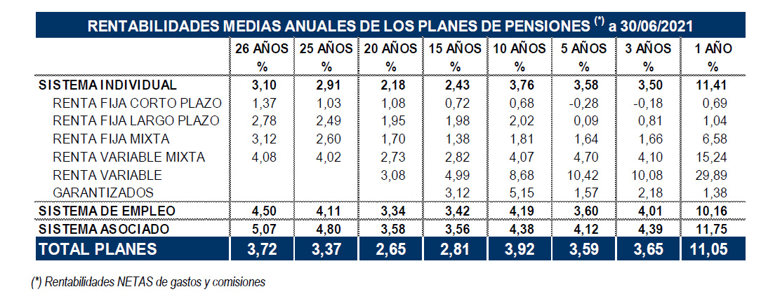 El estudio de la asociación destaca que los Planes de Pensiones presentan rentabilidades positivas en todos los plazos y en todas las categorías. Ésta es especial en la rentabilidad acumulada a 1 año donde supera el 11% para total de sistemas.