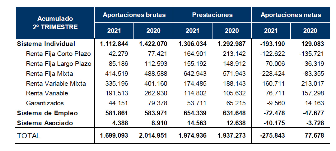 Por su parte, las aportaciones netas crecieron hasta junio en 276 millones, frente a los 78 millones de un año antes. Apunta Inverco que el origen de "este comportamiento fue la reducción en el volumen de las aportaciones brutas en el sistema individual". Éstas en el segundo trimestre se redujeron en un 15,6% hasta sumar 1.699 millones.