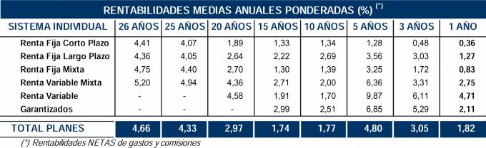 En el largo plazo los Planes de Pensiones alcanzan una rentabilidad media anual superior al 4,6% para el total de Planes. En el medio plazo (5 y 10 años) los Planes de Pensiones presentan una rentabilidad media anual del 4,8% y 1,8%, respectivamente.