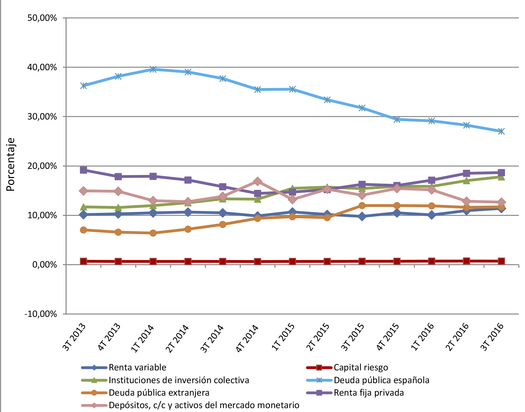La estructura de las inversiones de los Fondos de Pensiones muestra que la renta fija representa el 57,41% de la cartera. La deuda pública española “la partida de inversiones con mayor peso en las carteras, como se observa a lo largo de todo el periodo de referencia, si bien cada vez con menor porcentaje de la cartera”. En cambio, el mayor incremento de inversión en este trimestre por parte de los Fondos de Pensiones se produce en las instituciones de inversión colectiva.