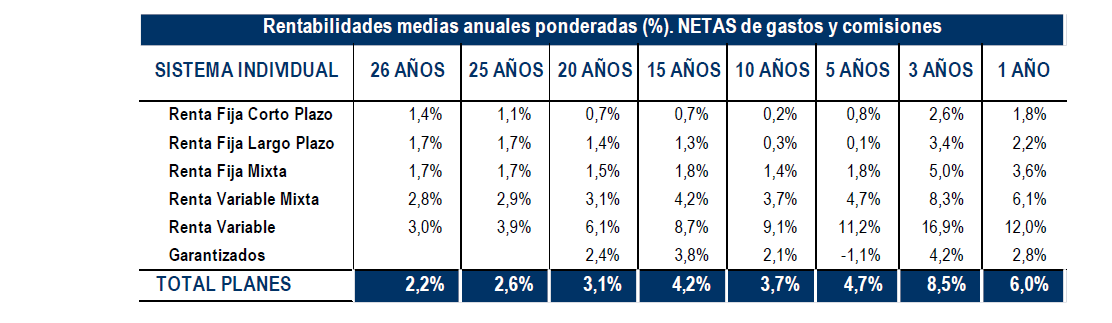 Los Planes de Pensiones Individuales cerraron diciembre con una rentabilidad positiva en el año del 6%, con mejores comportamientos en aquellas categorías con mayor exposición a renta variable. según los datos de Inverco. Los planes de renta variable obtuvieron una revalorización del 12% y los de renta variable mixta del 6,1%. En el largo plazo, la renta variable mantiene rentabilidades positivas del 11,2% a 5 años y del 9,1% a 10 años.