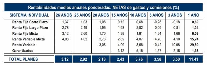 En el largo plazo los Planes de Pensiones continúan registrando una rentabilidad media anual (neta de gastos) del 3% y, en el medio plazo (10 y 15 años), presentan una rentabilidad del 3,8% y 2,4% respectivamente.