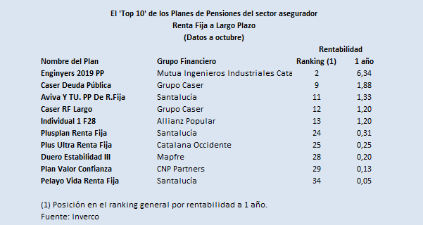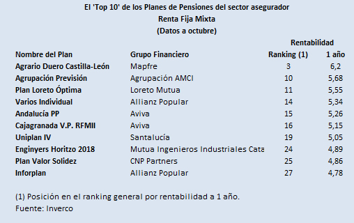 Mapfre comercializa los dos Planes de aseguradoras más rentables en octubre de las categorías mixtas. En renta fija mixta, Agrario Duero Castilla-León, con un rendimiento del 6,2% frente al 3,21% de la categoría, lo que le ha situado en el tercer puesto de la clasificación general. Y en renta variable mixta, BK Mixto 75 Bolsa, que acumula en un año hasta octubre una rentabilidad del 16,4% frente al 9,05% del conjunto de estos productos. Su puesto en el ranking general es el 4.