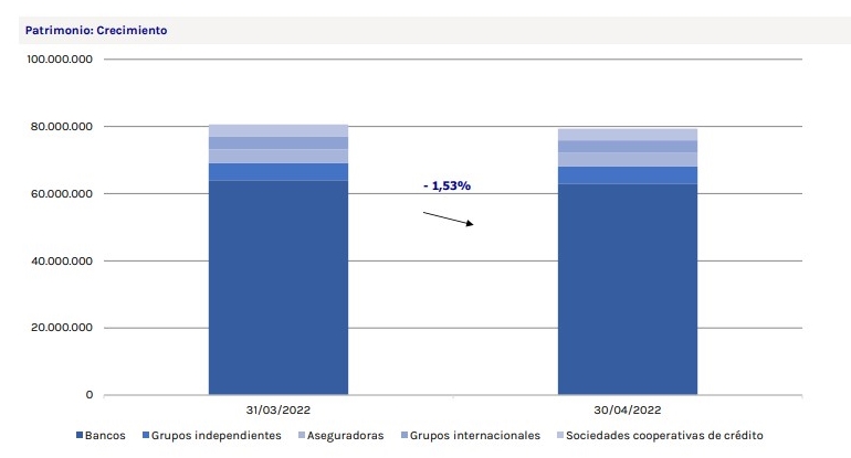 Por tipo de entidad, las sociedades cooperativas de crédito han registrado las mayores captaciones netas (26 millones) seguidas de las aseguradoras (5 millones). En términos porcentuales, todas han registrado descensos patrimoniales, siendo las sociedades cooperativas de crédito las que menos han caído (-1,15%).