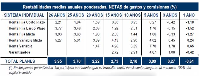 Los Planes de Pensiones del Sistema Individual situaron su rentabilidad anual en el mes de mayo de media en el -0,61% debido al mal comportamiento de la renta fija. Sin embargo, y según los datos de Inverco, a pesar de la volatilidad de los mercados financieros en este mes la Renta Variable y los de Renta Variable Mixta obtuvieron rentabilidad interanuales del 0,65% y del 0,24%, respectivamente.